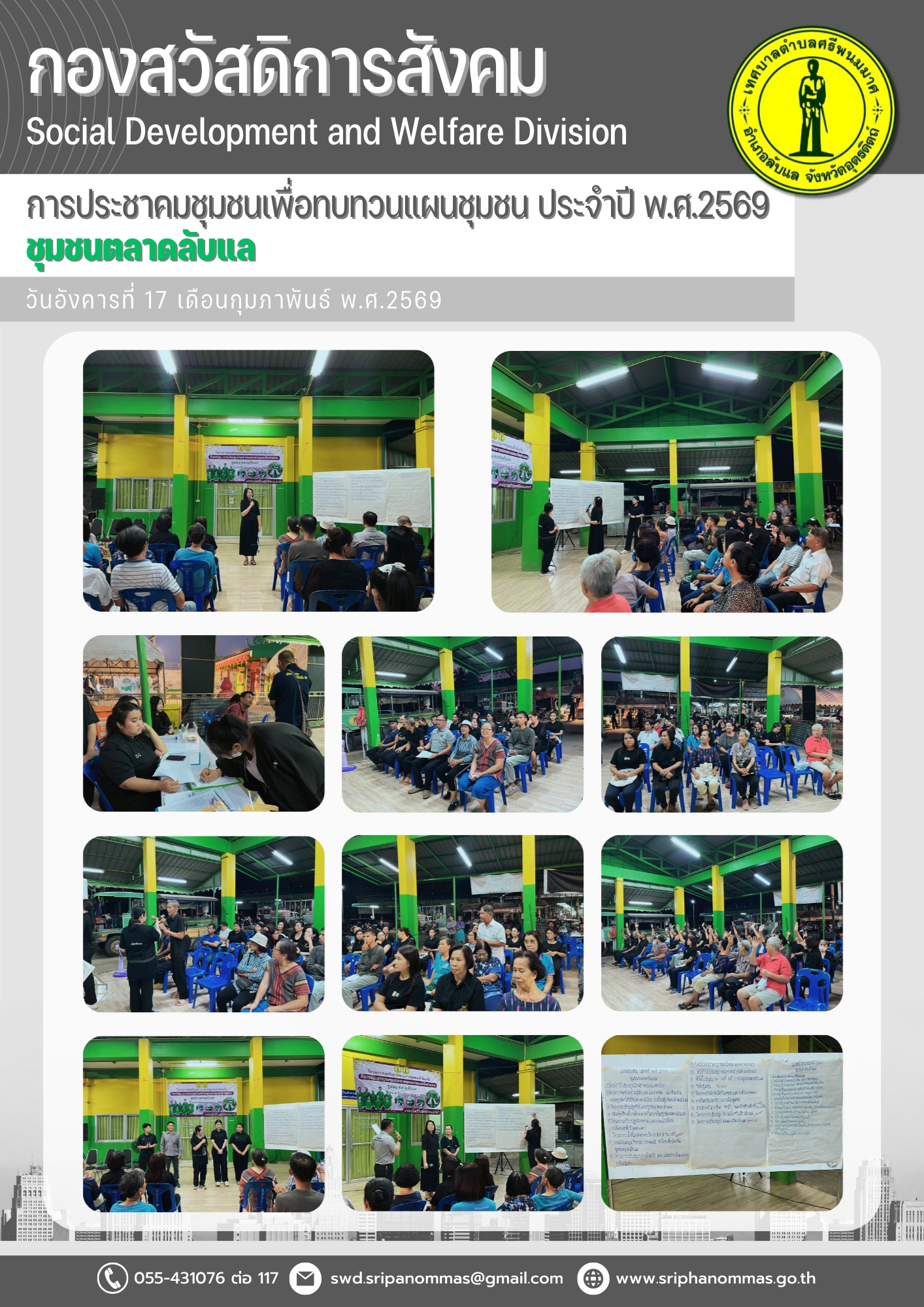 การประชาคมชุมชนเพื่อทบทวนแผนชุมชน ประจำปี พ.ศ.2569 ชุมชมตลาดลับแล17 กุมภาพันธ์ 2569 รศ.ดร.ทักษิณาร์ ศรุติสุต นายกเทศมนตรีตำบลศรีพนมมาศ เข้าร่วมการประชาคมชุมชนเพื่อทบทวนแผนชุมชน ประจำปี พ.ศ.2569 ณ ที่ทำการชุมชนในเขตเทศบาล โดยข้อมูลที่ได้จะใช้เป็นเครื่องมือสร้างความเข้มแข็งให้กับชุมชน เป็นรากฐานในการพัฒนาท้องถิ่น เพื่อการวางแผนพัฒนาท้องถิ่น รวมถึงเป็นการแก้ไขปัญหาต่างๆ สร้างความเข้มแข็งและความสามัคคีในชุมชน ส่งเสริมให้ประชาชนในชุมชนมีส่วนร่วมในการเสนอความคิดและใช้ประโยชน์ร่วมกัน จัดขึ้นระหว่าง 20 มกราคม – 24 กุมภาพันธ์ 2569