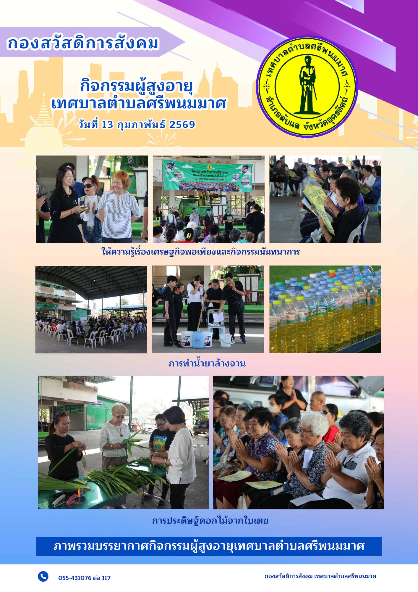 วันที่ 13 กุมภาพันธ์ 2569 โครงการจัดกิจกรรมผู้สูงอายุของเทศบาลตำบลศรีพนมมาศ ประจำเดือนกุมภาพันธ์ 2569รศ.ดร.ทักษิณาร์ ศรุติสุต นายกเทศมนตรีตำบลศรีพนมมาศนำคณะผู้บริหาร สมาชิกสภาเทศบาล และเจ้าหน้าที่เข้าร่วมกิจกรรม โดยมีเกมส์การละเล่นสำหรับผู้สูงอายุ กิจกรรมทำน้ำยาล้างจาน และประดิษฐ์ดอกไม้จากใบเตย