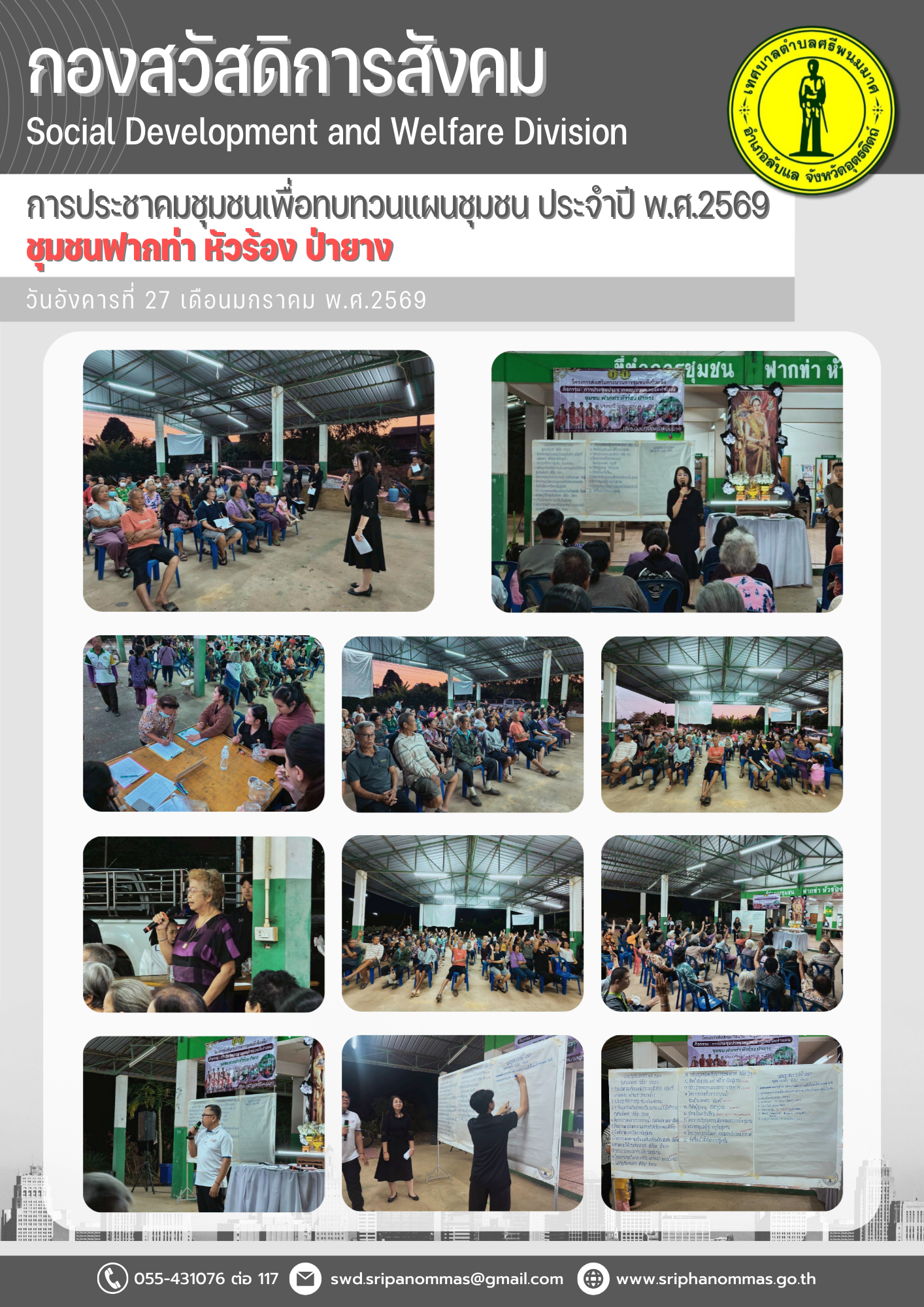 การประชาคมชุมชนเพื่อทบทวนแผนชุมชน ประจำปี พ.ศ.2569 ชุมชมฟากท่า หัวร้อง ป่ายาง27 มกราคม 2569 รศ.ดร.ทักษิณาร์ ศรุติสุต นายกเทศมนตรีตำบลศรีพนมมาศ เข้าร่วมการประชาคมชุมชนเพื่อทบทวนแผนชุมชน ประจำปี พ.ศ.2569 ณ ที่ทำการชุมชนในเขตเทศบาล โดยข้อมูลที่ได้จะใช้เป็นเครื่องมือสร้างความเข้มแข็งให้กับชุมชน เป็นรากฐานในการพัฒนาท้องถิ่น เพื่อการวางแผนพัฒนาท้องถิ่น รวมถึงเป็นการแก้ไขปัญหาต่างๆ สร้างความเข้มแข็งและความสามัคคีในชุมชน ส่งเสริมให้ประชาชนในชุมชนมีส่วนร่วมในการเสนอความคิดและใช้ประโยชน์ร่วมกัน จัดขึ้นระหว่าง 20 มกราคม – 24 กุมภาพันธ์ 2569