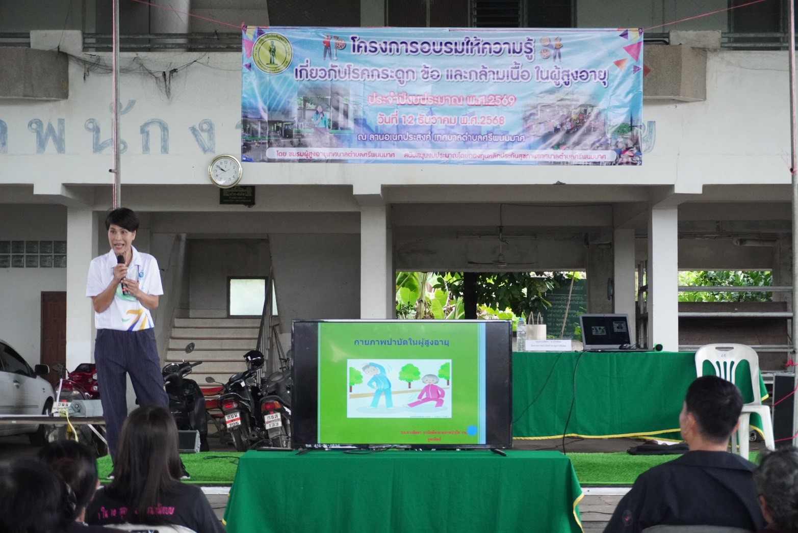 วันที่ 12 ธันวาคม 2568 รศ.ดร.ทักษิณาร์ ศรุติสุต นายกเทศมนตรีตำบลศรีพนมมาศร่วมกิจกรรมชมรมผู้สูงอายุเทศบาลตำบลศรีพนมมาศ ครั้งที่ 3/2569 พร้อมด้วยคณะผู้บริหาร สมาชิกสภาเทศบาล และเจ้าหน้าที่เข้าร่วม โดยกิจกรรมในครั้งนี้อยู่ภายใต้โครงการอบรมให้ความรู้เกี่ยวกับโรคกระดูก ข้อ และกล้ามเนื้อ ในผู้สูงอายุ ประจำปีงบประมาณ พ.ศ. 2569 ณ โดมอเนกประสงค์เทศบาลฯ ทั้งนี้เพื่อให้ผู้สูงอายุมีความรู้ ความเข้าใจและรู้จักวิธีป้องกันโรคกระดูก ข้อ และกล้ามเนื้อได้อย่างถูกต้องป้องกันความเสี่ยงต่อการเกิดความพิการ