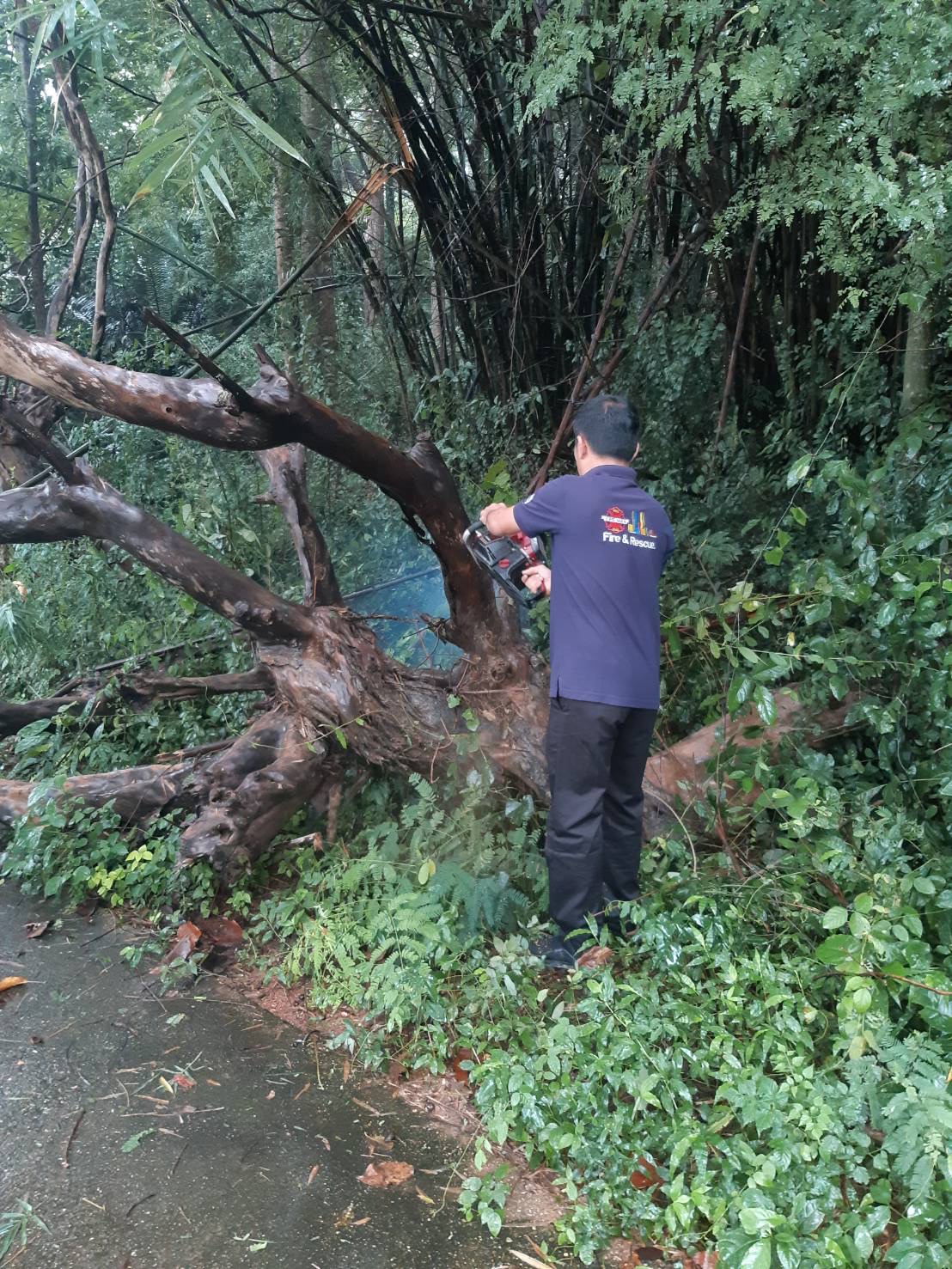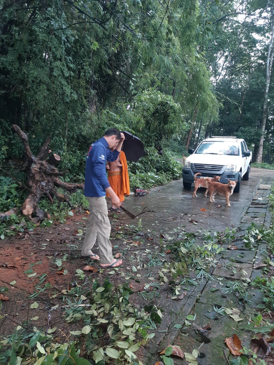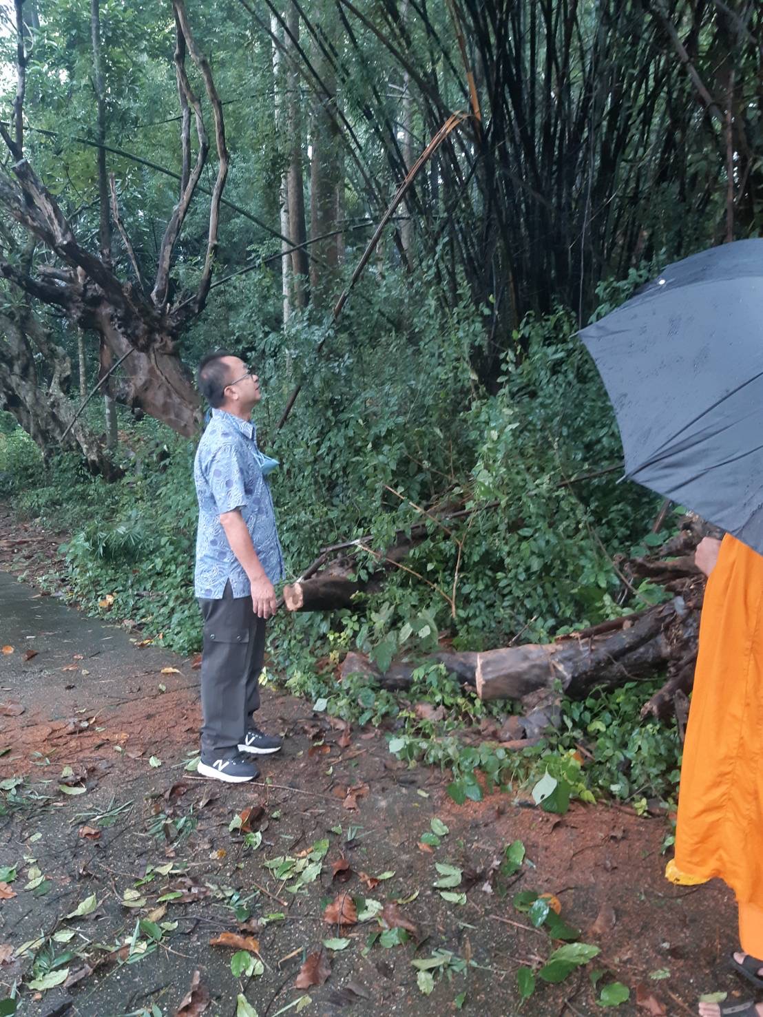งานป้องกันและบรรเทาสาธารณภัย เทศบาลตำบลศรีพนมมาศ ได้ลงพื้นที่เพื่อช่วยเหลือประชาชนที่สัญจรผ่านถนนบริเวณวัดม่อนปรางค์ สืบเนื่องจากลมพายุฝนพัดกิ่งไม้หักขวางการจราจร