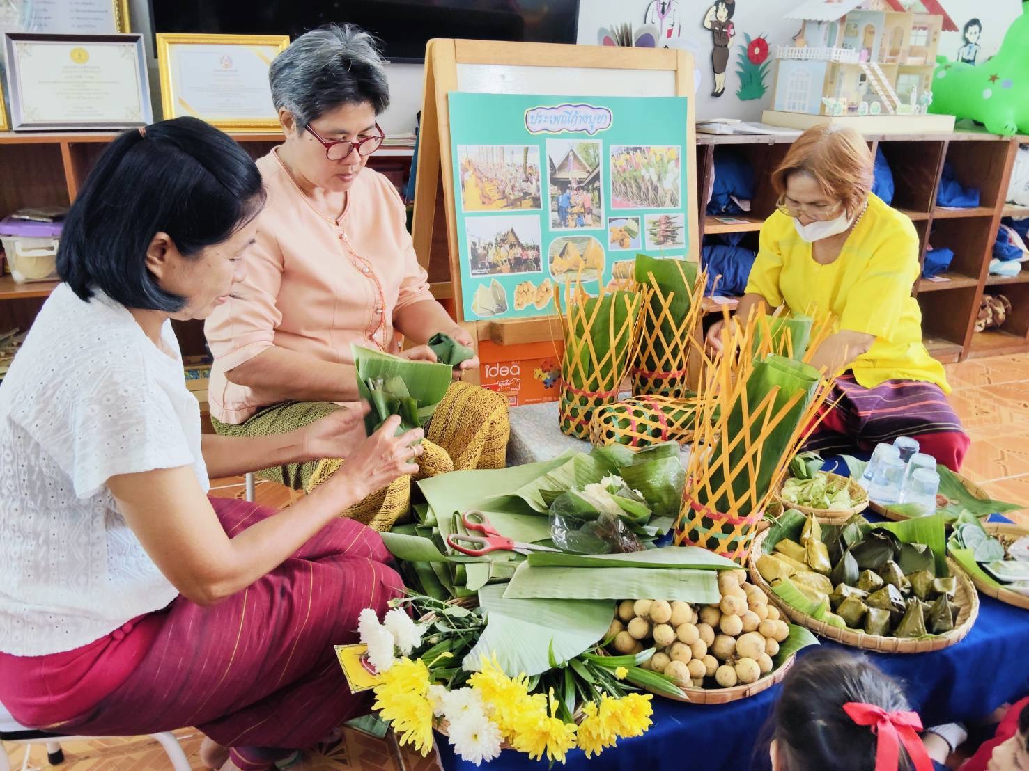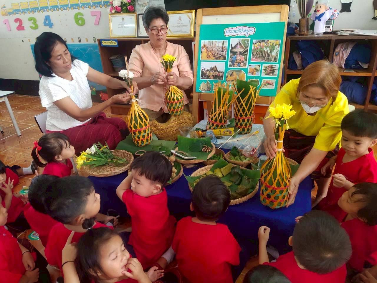 โดยมีตัวแทนผู้ปกครอง มาสอนจัดชะลอม เด็กได้เรียนรู้จากสื่อของจริง