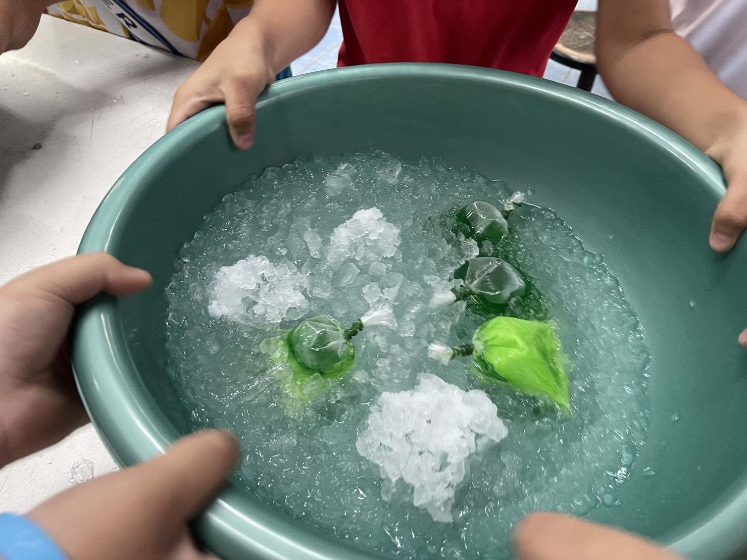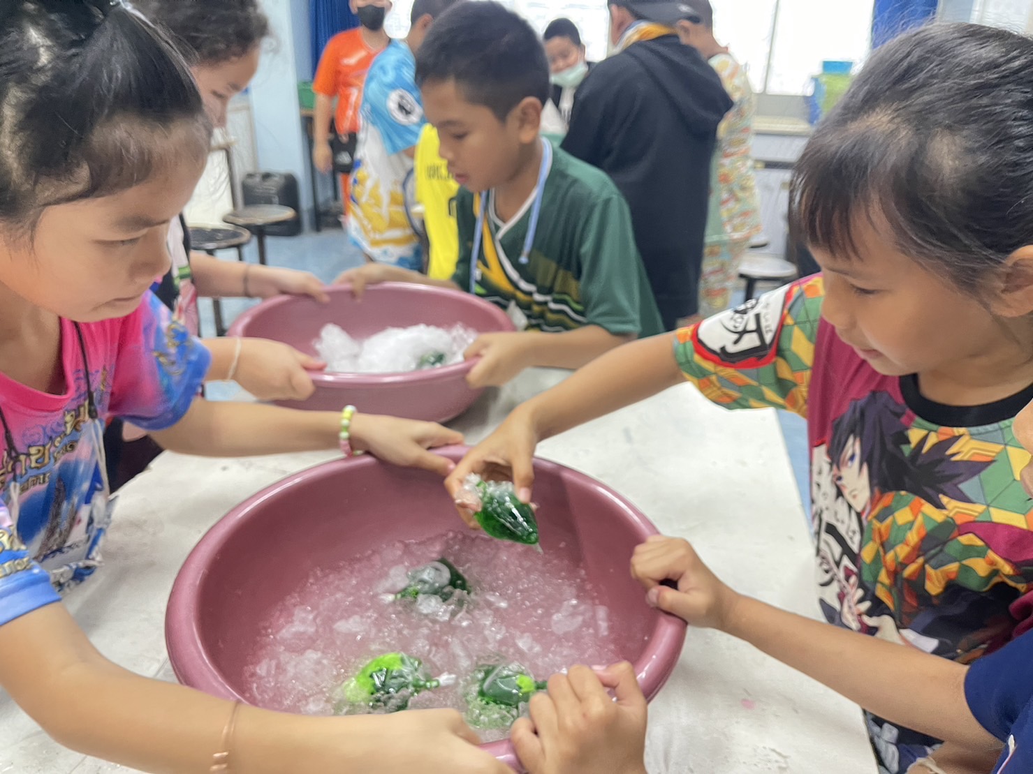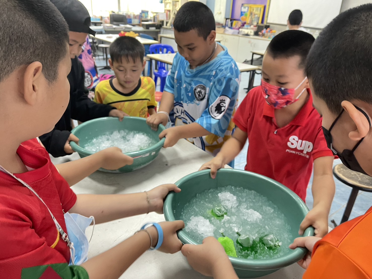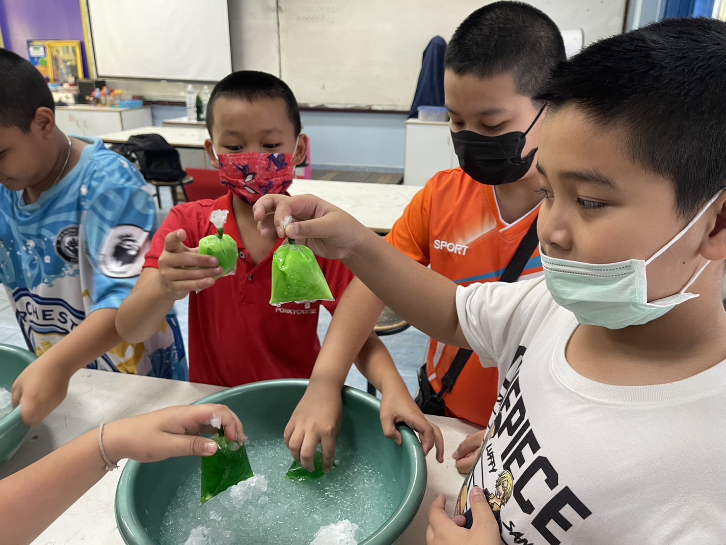 - เพลิดเพลินไปกับการสังเกตการเปลี่ยนสถานะของน้ำจากกิจกรรมการทำไอศกรีมเกล็ดน้ำแข็ง