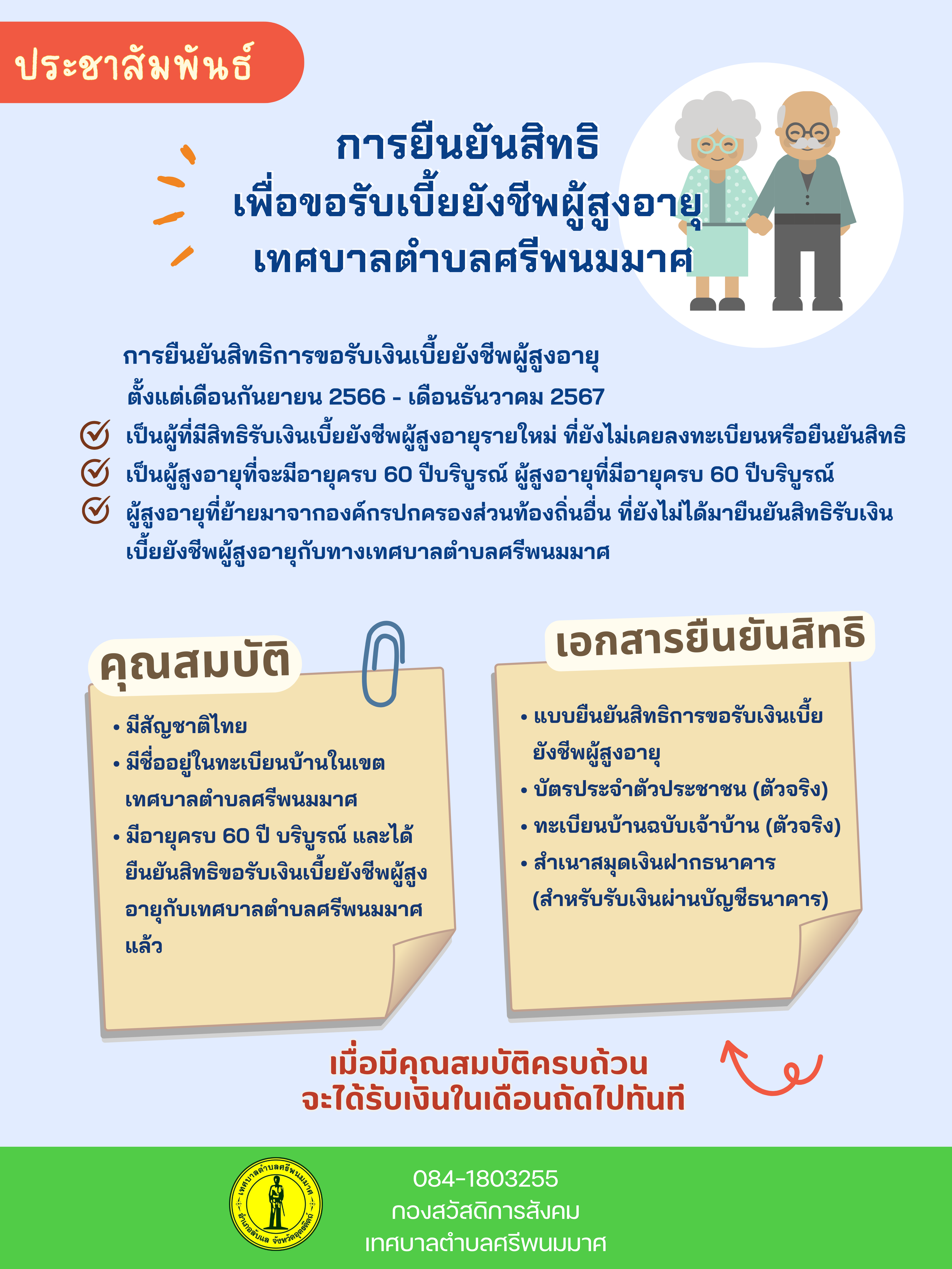 ประชาสัมพันธ์เรื่องการยืนยันสิทธิเพื่อขอเบี้ยยังชีพผู้สูงอายุเทศบาลตำบลศรีพนมมาศ