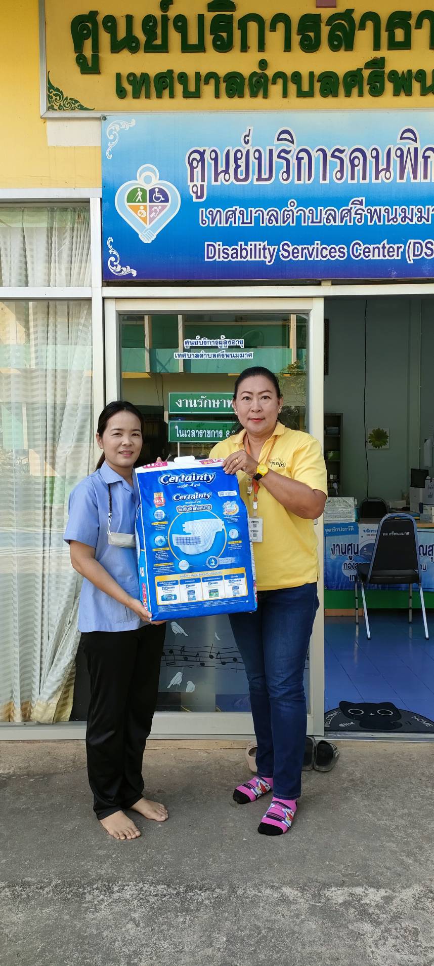 งานศูนย์บริการฯ เป็นตัวแทนศูนย์พัฒนาและฟื้นฟูคุณภาพชีวิตผู้สูงอายุตำบลศรีพนมมาศ รับมอบผ้าอ้อมผู้ใหญ่ จากคุณสุขุมาภรณ์ น้อยศรี และคุณศรีนวล ดีอุดม